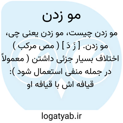 مو زدن. [ زَ دَ ] ( مص مرکب ) اختلاف بسیار جزئی داشتن ( معمولاً در جمله منفی استعمال شود ): قیافه اش با قیافه او مو نمیزند، یعنی کوچکترین اختلافی ندارد. ( از یادداشت مؤلف ). || در نهایت استقامت و راستی بودن. در استقامت اندک کجی نداشتن. در یک ردیف مستقیم قرار داشتن: رج آجرها که چیده است مو نمی زند، بر یک امتداد است. || در نهایت حساسیت بودن و جزئی اختلاف را نشان دادن چنانکه ترازوئی دقیق.