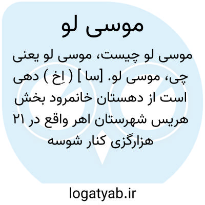موسی لو. [سا ] ( اِخ ) دهی است از دهستان خانمرود بخش هریس شهرستان اهر واقع در 21 هزارگزی کنار شوسه تبریز به اهر با 561 تن سکنه. آب آن از رود قوری چای و چشمه و راه آن ماشین رو است. ( از فرهنگ جغرافیائی ایران ج 4 ).