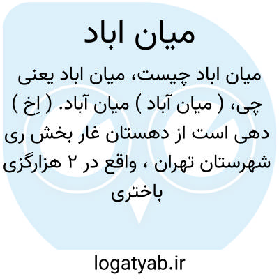 ( میان آباد ) میان آباد. ( اِخ ) دهی است از دهستان غار بخش ری شهرستان تهران، واقع در 2 هزارگزی باختری راه شوسه قم به تهران با 93 تن جمعیت. آب آن از قنات راه آن ماشین رو است. ( از فرهنگ جغرافیائی ایران ج 1 ).