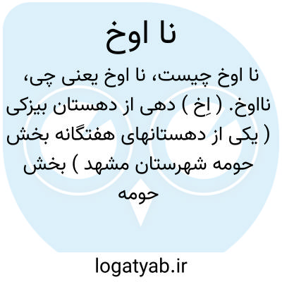 نااوخ. ( اِخ ) دهی از دهستان بیزکی ( یکی از دهستانهای هفتگانه بخش حومه شهرستان مشهد ) بخش حومه وارداک شهرستان مشهد، واقع در 27 هزارگزی شمال باختری مشهد و 2 هزارگزی جنوب کشف رود. جلگه است و هوایش معتدل است و 112 تن سکنه دارد، مردمش شیعی مذهب و فارسی زبانند. محصول آن، غلات. چغندر و سیب زمینی است، شغل اهالی زراعت و مالداری است. راه اتومبیل رو دارد. ( از فرهنگ جغرافیایی ایران ج 9 ص 415 ).