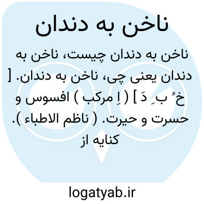 ناخن به دندان. [ خ ُ ب ِ دَ ] ( اِ مرکب ) افسوس و حسرت و حیرت. ( ناظم الاطباء ). کنایه از حیرت و افسوس. ( از برهان قاطع ). || ( ص مرکب ) متأسف. حیران. مغموم. مهموم. ( ناظم الاطباء ). به معنی انگشت به دندان است که کنایه از متأسف و متعجب باشد. ( آنندراج ). کنایه از متأسف و حیران باشد. ( از برهان قاطع ).، ناخن به دندان گرفتن. [ خ ُ ب ِ دَ گ ِ رِ ت َ ] ( مص مرکب ) حیران شدن. ( امثال و حکم دهخدا ). انگشت به دندان گرفتن که حیرت کردن و افسوس خوردن است. ( فرهنگ نظام ). ناخن به دندان ماندن. [خ ُ ب ِ دَ دَ] ( مص مرکب ) حسرت و افسوس کردن. ( شمس اللغات ). || متحیر ماندن. حیران ماندن. تعجب کردن. متعجب شدن. شگفتی: بدیشان از غنیمت داد چندان که خلقی ماند از آن ناخن به دندان.نزاری قهستانی ( از فرهنگ نظام ).