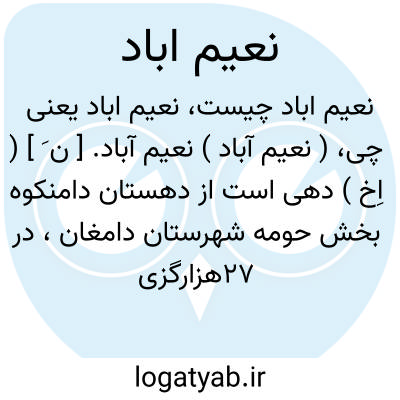 ( نعیم آباد ) نعیم آباد. [ ن َ ] ( اِخ ) دهی است از دهستان دامنکوه بخش حومه شهرستان دامغان، در 27هزارگزی مشرق دامغان، در جلگه معتدل هوائی واقع است و 690 نفر سکنه دارد. آبش از قنات تأمین می شود. محصولش غلات و پسته و حبوبات و پنبه و انگور و شغل اهالی زراعت و گله داری و کرباس بافی است. ( از فرهنگ جغرافیایی ایران ج 3 ).