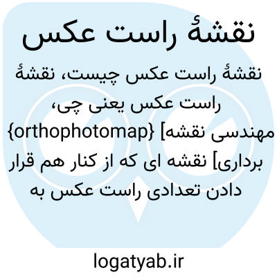 {orthophotomap} [مهندسی نقشه برداری] نقشه ای که از کنار هم قرار دادن تعدادی راست عکس به صورت تصویر مرکب واحد تهیه می شود