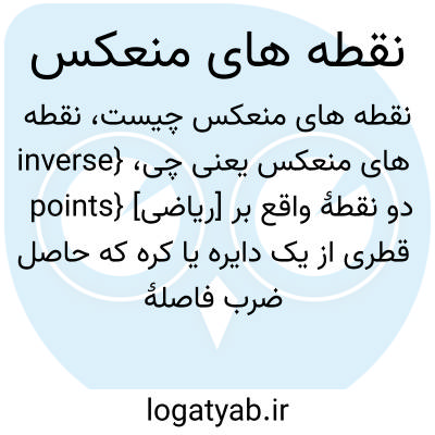 {inverse points} [ریاضی] دو نقطۀ واقع بر قطری از یک دایره یا کره که حاصل ضرب فاصلۀ آنها از مرکز برابر با مجذور شعاع باشد و هر دو نقطه نسبت به مرکز دایره یا کره در یک جهت باشند