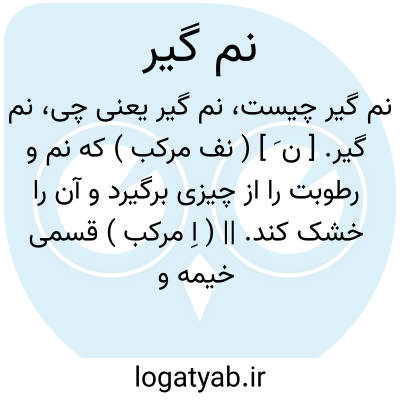 نم گیر. [ ن َ ] ( نف مرکب ) که نم و رطوبت را از چیزی برگیرد و آن را خشک کند. || ( اِ مرکب ) قسمی خیمه و شامیانه که برای دفع مضرت شبنم برپا کنند. ( از آنندراج ) ( از ناظم الاطباء ) ( فرهنگ فارسی معین ). نم گیره. ( آنندراج ):