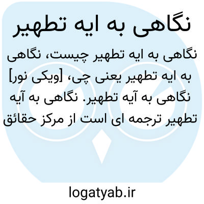 [ویکی نور] نگاهی به آیه تطهیر. نگاهی به آیه تطهیر ترجمه ای است از مرکز حقائق حقائق اسلامی از کتاب «آیة التطهیر» تألیف سید علی حسینی میلانی. این کتاب، در دفاع از مذهب اهل بیت(ع) و پاسخ به مخالفان تألیف شده است. آیه تطهیر ازجمله آیاتی است که شیعیان برای اثبات عصمت اهل بیت(ع) به آن استدلال می کنند.