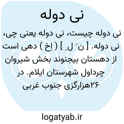 نی دوله. [ ن َ ل ِ ] ( اِخ ) دهی است از دهستان بیجنوند بخش شیروان چرداول شهرستان ایلام. در 26هزارگزی جنوب غربی چرداول، در منطقه کوهستانی گرمسیری واقع است و یکصد تن سکنه دارد. آبش از چشمه، محصولش غلات و لبنیات و شغل اهالی زراعت و گله داری است. ( از فرهنگ جغرافیائی ایران ج 5 ).