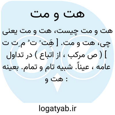هت و مت. [ هَِت ْ ت ُ م ِت ت ] ( ص مرکب، از اتباع ) در تداول عامه، عیناً. شبیه تام و تمام. بعینه: هت و مت فلان است؛ یعنی شباهتی تمام بدو دارد، بعینه اوست، یکباره شبیه به اوست. ( یادداشت مؤلف ).