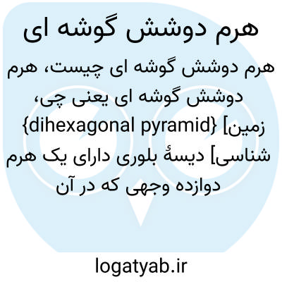 {dihexagonal pyramid} [زمین شناسی] دیسۀ بلوری دارای یک هرم دوازده وجهی که در آن هر برشِ عرضی عمود بر محور تقارن شش تایه (sixfold )، دوشش گوش است متـ. هرم دوشش گوش