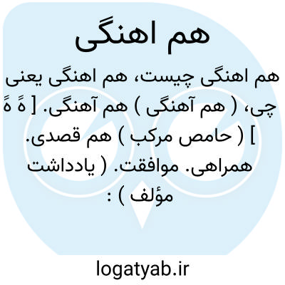 ( هم آهنگی ) ۱- توافق وتناسب وارتباط چندصدای مختلف در آن واحد. توضیح بشر سر رشت. این علم را در طبیعت پیدا کردن و در صدد تکمیل و تدوین آن بر آمده تا علمی جداگانه شده است. اولین کنجکاوی انسان برای پیدا کردن هماهنگی اصوات در قرون وسطی شروع شده و رفته رفته ترقی کردن تا آنکه در قرن هفدهم میلادی تدوین شده و موسیقیدانهای بزرگ اروپایی قطعات موسیقی خود را بوسیل. تکمیل این فن مقبول و پسندیده تر از ترکیبات سابق کردند. عنصر اصلی این علم توافقهاست و آنها چند نوت مختلف است که در یک آن با هم شنیده میشود. توافقها ممکن است از دو یا سه یا چهار یا پنج صدای مختلف تشکیل شود و دراین صورت توافقات دو صدایی و چهار صدایی و پنج صدایی موسوم میشود... ۲ - اتحاداتفاق.