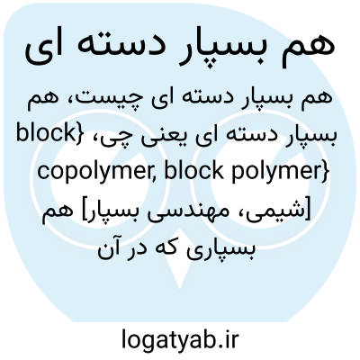 {block copolymer, block polymer} [شیمی، مهندسی بسپار] هم بسپاری که در آن واحدهای تکرارشوندۀ متفاوت A و B و غیره در توالی ها یا دسته های بلند قرار دارند و به طور خطی به هم متصل اند