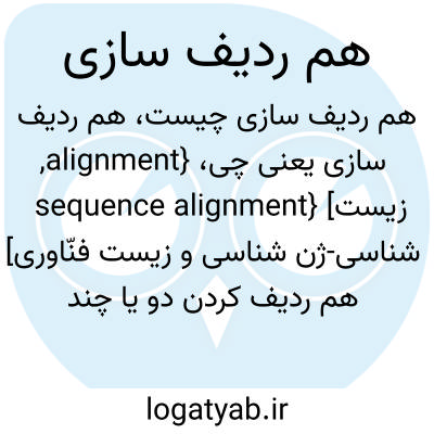 {alignment, sequence alignment} [زیست شناسی-ژن شناسی و زیست فنّاوری] هم ردیف کردن دو یا چند توالی از رشته های نوکلئیک اسید یا آمینواسید برای یافتن توالی های مشابه