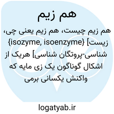 {isozyme, isoenzyme} [زیست شناسی-پروتگان شناسی] هریک از اشکال گوناگون یک زی مایه که واکنش یکسانی برمی انگیزند، اما تـوالی ژنی و خصوصیات فیزیکی شیمیایی متفاوت دارند