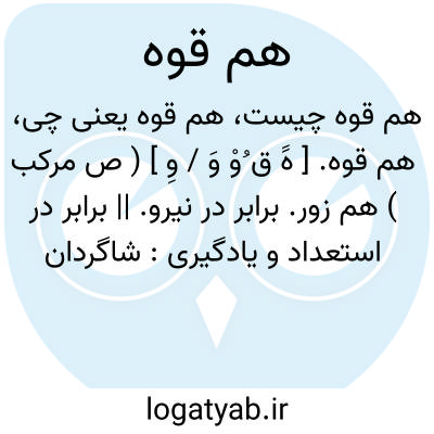 هم قوه. [ هََ ق ُوْ وَ / وِ ] ( ص مرکب ) هم زور. برابر در نیرو. || برابر در استعداد و یادگیری: شاگردان کلاس، هم قوه نیستند. ( یادداشت مؤلف ).