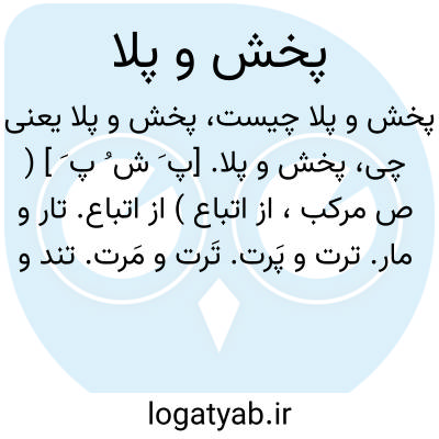 پخش و پلا. [پ َ ش ُ پ َ ] ( ص مرکب، از اتباع ) از اتباع. تار و مار. ترت و پَرت. تَرت و مَرت. تند و خند. پَرت و پلا.