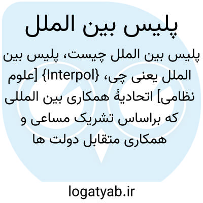 {Interpol} [علوم نظامی] اتحادیۀ همکاری بین المللی که براساس تشریک مساعی و همکاری متقابل دولت ها برای مبارزه با جرایم و مجرمین بین المللی و برقراری نظم و امنیت عمومی کشورها و استقرار عدالت تأسیس شده است و کشورهای عضو آن اطلاعات خود را در مورد جرایم، بدون درگیر ش...