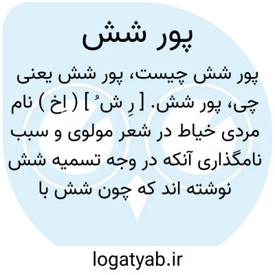 پور شش. [ رِ ش ُ ] ( اِخ ) نام مردی خیاط در شعر مولوی و سبب نامگذاری آنکه در وجه تسمیه شش نوشته اند که چون شش با آدمی باید یعنی نفس در آن داخل میشود و از آن خارج میگردد و چون مروحه دائماً بادپیمائی میکند چنانکه مروحه قلب نیز بهمین سبب او را میگویند وآن خیاط بیهوده گو و بادپیما بوده است پور شش لقب اونهاده اند. ( حاشیه مثنوی چ علاءالدوله ):