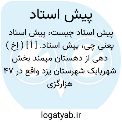 پیش استاد. [ اُ ] ( اِخ ) دهی از دهستان میمند بخش شهربابک شهرستان یزد واقع در 47 هزارگزی شمال خاوری شهر بابک و 16 هزارگزی راه فرعی نجف آباد به فیض آباد شهر بابک. کوهستانی، معتدل مالاریائی دارای 223 تن سکنه. آب آنجا از قنات. محصول آن غلات. شغل اهالی زراعت. صنایع دستی زنان آنجا قالی و کرباس بافی وراه آن مالروست. ( از فرهنگ جغرافیایی ایران ج 10 ).