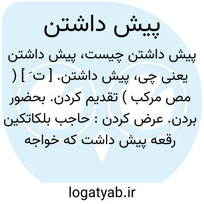 ( مصدر ) ۱- تقدیم کردن عرض کردن:... بر جملگی ولایت پدر از دست خلیفتو تاج و طوق و اسب سواری پیش داشتند.۲- در حضور داشتن در مجلس و بارگاه داشتن: می سوری بخواه کامد رش مطربان پیش دار وباده بکش. ( خسروی ) ۳- مقدم داشتن:گفت: ای خداوند من. در همسایگی خود بنا کن مرا خانه ای. اول همسایگی پیش داشت آنگاه خانه. ۴- جلو آوردن بر جسته ساختن از حد طبیعی برتر و آماسیده تر نمودن ( چنانکه عضوی ): جمل. آن زر که بر خویش داشت بذل شکم کرد و شکم پیش داشت. ( نظامی ) یا در پیش داشتن شغلی ( کاری ) را. در برابر داشتن آن: و شغلی در پیش داریم چنانکه سخت پیداست سخت زود فیصل خواهد شد.