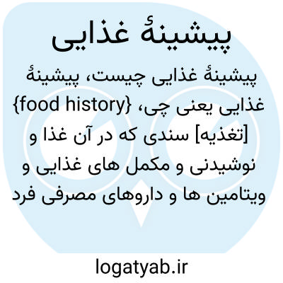{food history} [تغذیه] سندی که در آن غذا و نوشیدنی و مکمل های غذایی و ویتامین ها و داروهای مصرفی فرد در یک بازۀ زمانی معین ثبت شده است