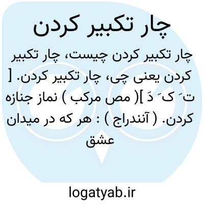 چار تکبیر، دگر روز برین پنج کند.انوری.چار تکبیر بر آن حضرت کرد و عنان عزیمت بر صوب غور و غزنین گردانید. ( بدایع الازمان ص 109 ). و رجوع به چارتکبیر زدن شود. || کنایه از ترک همه چیز یا همه کس گفتن. از همه کس یا از همه چیز گذشتن. پشت پا به دنیا و ما فیها زدن. کنایه از ترک کردن همه چیز را. ( آنندراج ):