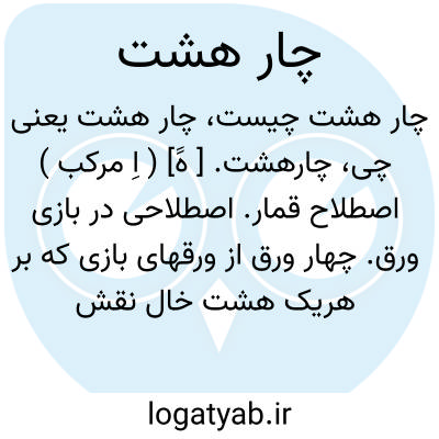 چارهشت. [ هََ] ( اِ مرکب ) اصطلاح قمار. اصطلاحی در بازی ورق. چهار ورق از ورقهای بازی که بر هریک هشت خال نقش شده باشد. چهار ورق هشت خال ( هشت خال گلابی سیاه [ پیک ] و هشت خال خاج [ گشنیز ] و هشت خال دل و هشت خال خشت ).