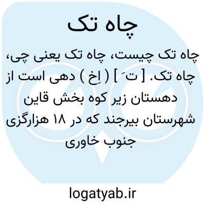 چاه تک. [ ت َ ] ( اِخ ) دهی است از دهستان زیر کوه بخش قاین شهرستان بیرجند که در 18 هزارگزی جنوب خاوری قاین واقع شده. جلگه و گرمسیر است و 13 تن سکنه دارد. ( از فرهنگ جغرافیایی ایران ج 9 ).