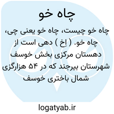 چاه خو. ( اِخ ) دهی است از دهستان مرکزی بخش خوسف شهرستان بیرجند که در 54 هزارگزی شمال باختری خوسف واقع شده. جلگه و گرمسیر است و 24 تن سکنه دارد. آبش از قنات، محصولش غلات، شغل اهالی زراعت وراهش مالرو است. ( از فرهنگ جغرافیایی ایران ج 9 ).