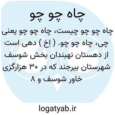 چاه چو چو. ( اِخ ) دهی است از دهستان نهبندان بخش شوسف شهرستان بیرجند که در 30 هزارگزی خاور شوسف و 8 هزارگزی جنوب حسین آباد واقع شده، دامنه و گرمسیر است و 20 تن سکنه دارد. آبش از قنات، محصولش لبنیات و راهش مالرو است. در فصل بهار مالدارها به این محل میایند. ( از فرهنگ جغرافیایی ایران ج 9 ).