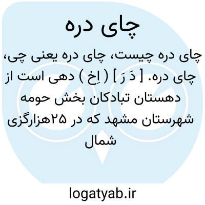 چای دره. [ دَ رَ ] ( اِخ ) دهی است از دهستان تبادکان بخش حومه شهرستان مشهد که در 25هزارگزی شمال خاوری مشهد، سر راه مالرو عمومی مشهد بکلات واقع شده. جلگه و سردسیر است و 510 تن سکنه دارد. آبش از قنات، محصولش غلات، شغل اهالی زراعت و مالداری و راهش مالرو است. ( از فرهنگ جغرافیایی ایران، ج 9 ).