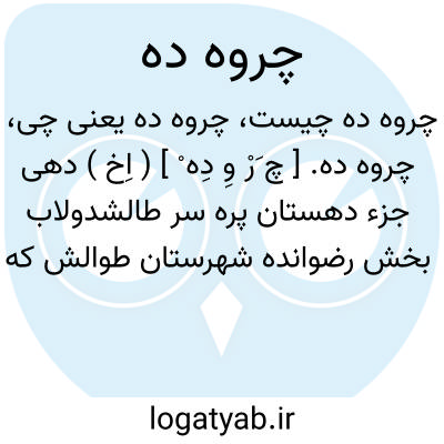 چروه ده. [ چ َرْ وِ دِه ْ ] ( اِخ ) دهی جزء دهستان پره سر طالشدولاب بخش رضوانده شهرستان طوالش که در 9هزارگزی شمال باختر رضوانده و یک هزارگزی باختر راه شوسه انزلی به آستارا واقع است. جلگه و مرطوبست و 1424 تن سکنه دارد. آبش از رودخانه دنیاچال، محصولش غلات، برنج و لبنیات، شغل اهالی زراعت و شالبافی وراهش مالرو است. ( از فرهنگ جغرافیایی ایران ج 2 ).