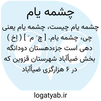 چشمه یام. [ چ َ م َ ] ( اِخ ) دهی است جزءدهستان دودانگه بخش ضیأآباد شهرستان قزوین که در 6 هزارگزی ضیأآباد و 6 هزارگزی راه شوسه واقع است و270 تن سکنه دارد. محصول این آبادی غله، کشمش، بادام و گردو است. شغل اهالی زراعت و بافتن قالی و گلیم و راهش مالرو است. ( از فرهنگ جغرافیایی ایران ج 1 ).