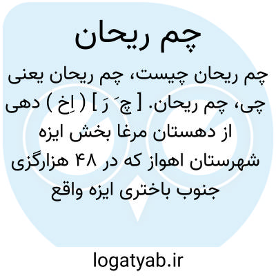 چم ریحان. [ چ َ رَ ] ( اِخ ) دهی از دهستان مرغا بخش ایزه شهرستان اهواز که در 48 هزارگزی جنوب باختری ایزه واقع است. کوهستانی و معتدل است و 195 تن سکنه دارد. آبش از چشمه. محصولش گندم و جو. شغل اهالی زراعت وراهش مالرو است. ( از فرهنگ جغرافیایی ایران ج 6 ).