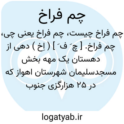 چم فراخ. [ چ َ ف َ ] ( اِخ ) دهی از دهستان یک مهه بخش مسجدسلیمان شهرستان اهواز که در 25 هزارگزی جنوب خاوری مسجدسلیمان و 2 هزارگزی خاور راه شوسه مسجدسلیمان به هفت گل واقع است. کوهستانی است و 550تن سکنه دارد. آبش از تعبیان. محصولش غلات. شغل اهالی کارگری شرکت نفت، زراعت و گله داری و راهش اتومبیل رو است. ساکنین این آبادی از طایفه هفت لنگ بختیاری میباشند و این آبادی از محل های حاجی آباد و دره گاومیش تشکیل شده است. ( از فرهنگ جغرافیایی ایران ج 6 ).