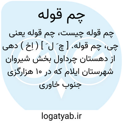 چم قوله. [ چ َ ل َ ] ( اِخ ) دهی از دهستان چرداول بخش شیروان شهرستان ایلام که در 10 هزارگزی جنوب خاوری چرداول، کنار راه مالرو شیروان واقع است. کوهستانی و گرمسیر است و 50 تن سکنه دارد. آبش از رودخانه چرداول. محصولش غلات و لبنیات. شغل اهالی زراعت و گله داری و راهش مالرو است. ( از فرهنگ جغرافیایی ایران ج 5 ).
