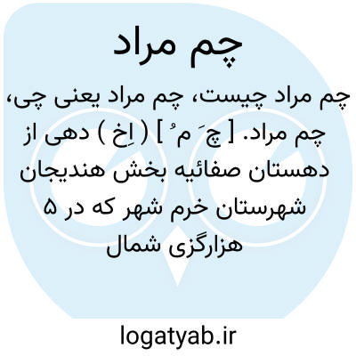 چم مراد. [ چ َ م ُ ] ( اِخ ) دهی از دهستان صفائیه بخش هندیجان شهرستان خرم شهر که در 5 هزارگزی شمال خاوری هندیجان در کناره خاوری رودخانه زهره واقع است.دشت و گرمسیر است و 160 تن سکنه دارد. آبش از رودخانه زهره. محصولش غلات. شغل اهالی زراعت و حشم داری. راهش در تابستان اتومبیل رو است. ساکنان آبادی از طایفه افشار میباشند. ( از فرهنگ جغرافیایی ایران ج 6 ).