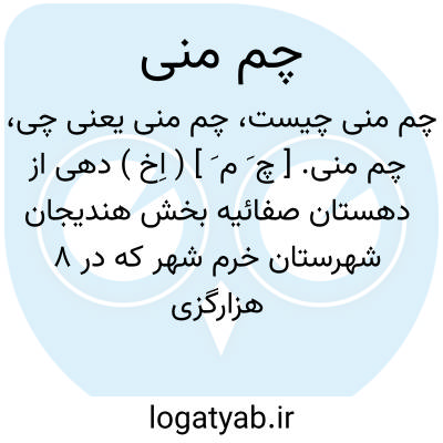 چم منی. [ چ َ م َ ] ( اِخ ) دهی از دهستان صفائیه بخش هندیجان شهرستان خرم شهر که در 8 هزارگزی شمال خاوری هندیجان بر سر راه فرعی اتومبیل رو هندیجان به ده ملاو در حاشیه خاوری رودخانه زهره واقع است. محصولش غلات. شغل اهالی زراعت و حشم داری و راه آنجا در تابستان اتومبیل رو است. ساکنان آبادی از طایفه افشار میباشند. ( از فرهنگ جغرافیایی ایران ج 6 ).