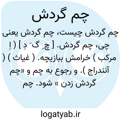 چم گردش. [ چ َ گ َ دِ] ( اِ مرکب ) در تداول روستائیان فیض آباد محولات بخش تربت حیدریه بمعنی پیچ و خم دیوار و پیچ و خم کوچه و نظایر اینهاست. خم کوچه و خم دیوار و امثال اینها.