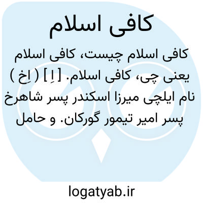 کافی اسلام. [ اِ ] ( اِخ ) نام ایلچی میرزا اسکندر پسر شاهرخ پسر امیر تیمور گورکان. و حامل مکتوب این امیرزاده مبنی بر مخالفت با پدر و انقیاد از او به امراء حوالی اصفهان و خراسان. وی بدست ملک قطب الدین حاکم سیستان مقید شد و به نزد میرزا فرزند شاهرخ سیورغتمش در هرات فرستاده شد. ( حبیب السیر ج 3 ص 588 ).