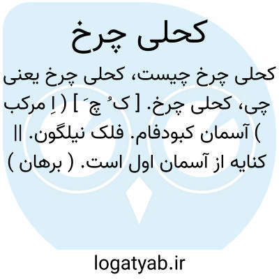 لغت نامه دهخدا کحلی چرخ. [ ک ُ چ َ ] ( اِ مرکب ) آسمان کبودفام. فلک نیلگون. || کنایه از آسمان اول است. ( برهان ) ( آنندراج ). آسمان اول. ( ناظم الاطباء ). || سیاهی آسمان. ( برهان ) ( آنندراج ). تاریکی آسمان. ( ناظم الاطباء ). || سیاهی شب. ( برهان ) ( آنندراج ) ( ناظم الاطباء ).