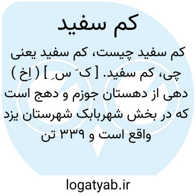 کم سفید. [ ک َ س ِ ] ( اِخ ) دهی از دهستان جوزم و دهج است که در بخش شهربابک شهرستان یزد واقع است و 339 تن سکنه دارد. ( از فرهنگ جغرافیایی ایران ج 10 ).