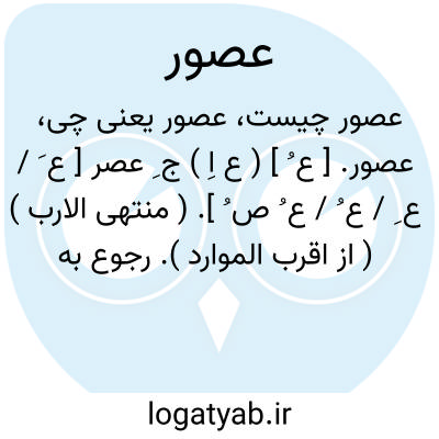 ۱ - زمان روزگار دوره جمع اعصر عصور اعصار: عنصری از شاعران عصر غزنوی است. یا عصر آهن. قسمتی از دوره فلزات است که شامل زمان کنونی نیز می شود. این عصر از زمان پیدایش آهن که تقریبا یک هزار و پانصد سال قبل از میلاد مسیح است شروع می شود و تا کنون ادامه دارد. یا عصر اتم. مقصود زمان کنونی است و شروعش از زمان استفاده از نیروی اتمی در صنایع اتمی در صنایع بشر است که تقریبا از سال ۱۹۴۵ میلادی شروع می شود. یا عصر حجر. قسمت اعظم دوران چهارم زمین شناسی متعلق باین عصر است که از طبقات فوقانی دوره اول دوران چهارم شروع و به ابتدای عصر فلزات ختم می شود. این عصر بدو دوره حجر قدیم ( پارینه سنگی ) و حجر قدیم ( نو سنگی ) تقسیم می شود. یا عصر حجر جدید. نو سنگی. یا عصر حجر قدیم. پارینه سنگی. یا عصر طلایی. دوره ای در تاریخ یک کشور که ادبیات علوم و صنایع و عوامل و صنایع و عوامل دیگر تمدن ترقی کامل کرده باشد مثل دوره پریکلس در یونان قدیم. ۲ - هر یک از تقسیمات کوچکتر از دوران ( عهد ) در زمین شناسی که شامل چندین طبقه می باشد. و آن دارای آثار و بقایای گیاهی و جانوری مشخص است و اغلب رسوباتش در نقاط مختلف مشابهند دوره توضیح گاهی کلمه عصر را در برخی نوشته ها و کتب جهت تقسیمات کوچکتر از دوره حتی تقسیمات کوچکتر به کار برده اند و باین ترتیب برای کلمه عصر یک زمان مشخص زمین شناسی نمی توان قائل شد باین جهت می توانیم کلمه عصر را در زمین شناسی مرادف با تقسیمات مختلف ذکر کنیم از قبیل عصر حجر قدیم و یا عصر حجر جدید که هر دو تقسیماتی کوچکتر از عصر حجر هستند و یا عصر آهن و عصر مفرغ که هر دو تقسیماتی کوچکتر از دوره فلزات می باشند. یا عصر مفرغ. قسمت ابتدایی دوره فلزات است که از زمان پیدایش فلزات شروع و به دوره آهن ختم می شود. ابتدای این عصر قریب پنج هزار سال قبل از میلاد مسیح است. ۳ - آخر روز تا هنگام غروب پسین جمع اعصر عصور. یا عصر تنگ. عصر آن وقت که هوا تاریک شود. ۴ - نمازی که در عصر خوانند صلوه عصر.