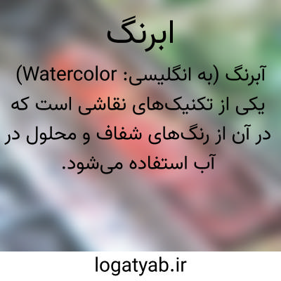 آبرنگ. آبرنگ یک رنگ ماده و نیز نقاشی یا طرحی که با این نوع رنگ ماده اجرا شده باشد است. در تولید آبرنگ از رنگ دانه و یک ماده چسبنده قابل حل در آب ( معمولاً صمغ عربی ) استفاده می شود. آبرنگ را به وسیله قلم مو بر روی کاغذ، مقوا، پاپیروس و… به کار می برند. از این جهت با بسیاری از رنگ ماده های پوششی تفاوت دارد که در آن سایه های رنگ روشن از طریق رقیق کردن رنگ ماده حاصل می آید و نه با افزودن سفید.