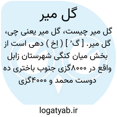گل میر. [ گ ُ ] ( اِخ ) دهی است از بخش میان کنگی شهرستان زابل واقع در 8000گزی جنوب باختری ده دوست محمد و 4000گزی جنوب راه مالرو ده دوست محمد به زابل. هوای آن گرم معتدل و دارای 129 تن سکنه است. آب آن از رودخانه هیرمند و محصول آن غلات و پنبه و شغل اهالی زراعت و صنایع دستی آنان کرباس بافی است. راه مالرو دارد. ( از فرهنگ جغرافیایی ایران ج 8 ).