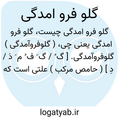 ( گلوفروآمدگی ) گلوفروآمدگی. [ گ ُ / گ َ ف ُ م َ دَ / دِ ] ( حامص مرکب ) علتی است که در گلو پدیدآید و آنرا اطبا خناق گویند. ( شعوری ج 2 ورق 208 ).