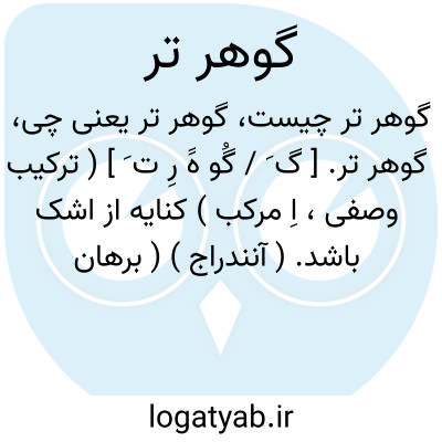گوهر تر. [ گ َ / گُو هََ رِ ت َ ] ( ترکیب وصفی، اِ مرکب ) کنایه از اشک باشد. ( آنندراج ) ( برهان قاطع ) ( بهار عجم ). سرشک دیده. || کنایه از سخن با آب و تاب باشد. ( آنندراج ). فصاحت و بلاغت. سخنوری. کلمات نغز و حکیمانه.