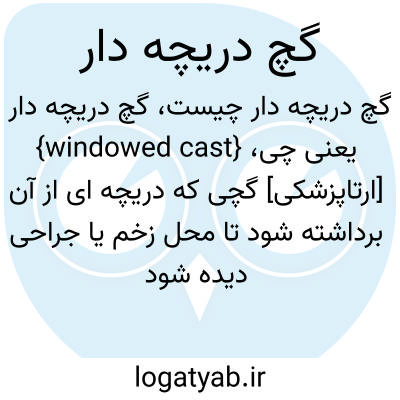 {windowed cast} [ارتاپزشکی] گچی که دریچه ای از آن برداشته شود تا محل زخم یا جراحی دیده شود