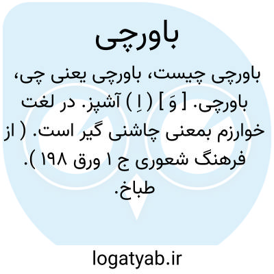 باورچی. [ وَ ] ( اِ ) آشپز. در لغت خوارزم بمعنی چاشنی گیر است. ( از فرهنگ شعوری ج 1 ورق 198 ). طباخ. قدار. ( منتهی الارب ). دیگ پز. پزنده. خوالیگر. خورده پز. مطبخی. خوراک پز. در هندوستان طباخ و آشپز را گویند. پیشکار طعام. ( آنندراج ). طباخ. ( فرهنگ نظام ) ( ناظم الاطباء ):