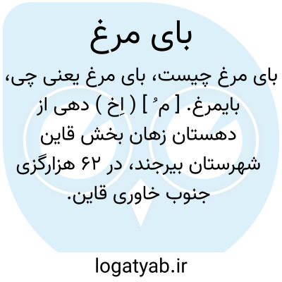 بایمرغ. [ م ُ ] ( اِخ ) دهی از دهستان زهان بخش قاین شهرستان بیرجند، در 62 هزارگزی جنوب خاوری قاین. سکنه آن 80 تن آب آنجا از قنات، شغل اهالی زراعت است. ( از فرهنگ جغرافیائی ایران ج 9 ).