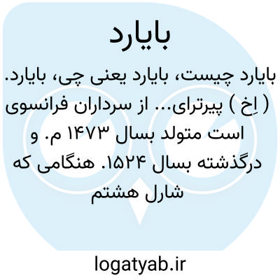 بایارد. ( اِخ ) پیرترای... از سرداران فرانسوی است متولد بسال 1473 م. و درگذشته بسال 1524. هنگامی که شارل هشتم در سال 1493 به ایتالیا رفت، بایارد نیز در جنگ شرکت داشت. او تا حوالی ناپل پیشروی کرد. بسال 1503 م. در جنگهای اسپانیا شرکت و در جنگ خونین 1512 راون فتوحات درخشان داشت. وی از معروفترین شوالیه های تاریخ فرانسه محسوب میشود.